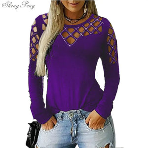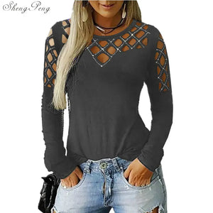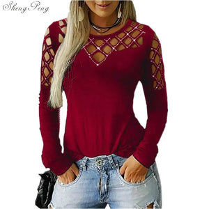 Fashion Hollow Bling Blouse Casual Sexy Rhinestone Solid Top Female Women Tops Long Sleeve Shirt Blusa Pullover 5XL V1755