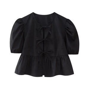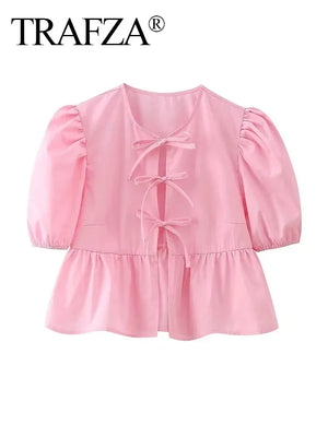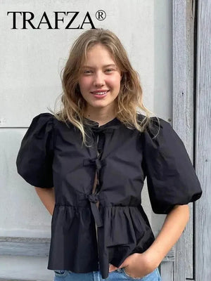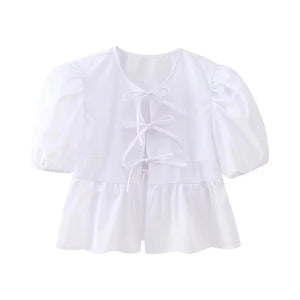 Fashion Solid Hollow Out Shirt Women Causal O Neck Short Sleeved Lace Up Tops Chic Female Casual Blouse Streetwear