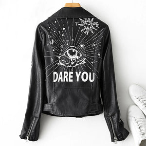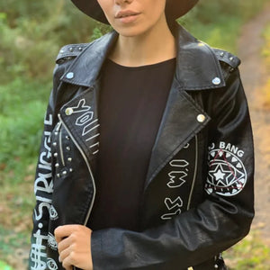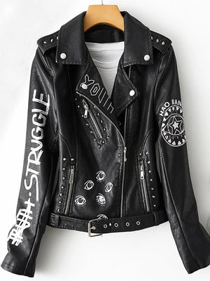 Fitaylor Autumn Winter Women Graffiti Print Faux Leather Jacket Lady Moto Bike PU Leather Coat Casual Rivet Jacket with Belt