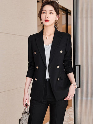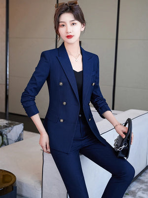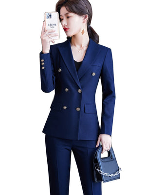 High Quality Women Navy Blue Black Pant Suit Female Button Decoration Blazer and Trouser 2 Piece Set For Office Ladies Work Wear