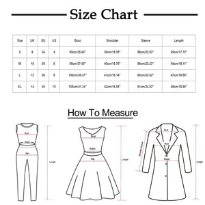 | Size:L | UK:12 | EU:38 | US:8 | Bust:100cm/39.37'' | Shoulder:41cm/16.14'' | Sleeve:60cm/23.62'' | Length:47cm/18.50'' |