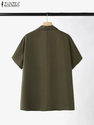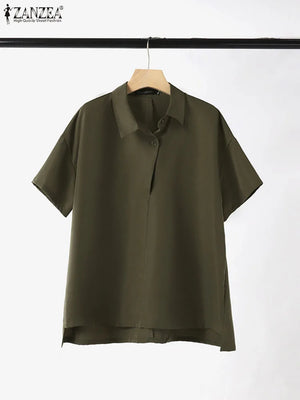 Korean Style Solid Color Shirts Women Summer Asymmetrical Lapel Neck Oversize Blouse Casual Half Sleeve Chemise Tops