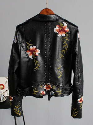 Ly Varey Lin Floral Print Embroidery Faux Soft Leather Jacket Women Pu Motorcycle Coat Female Black Punk Zipper Rivet Outerwear