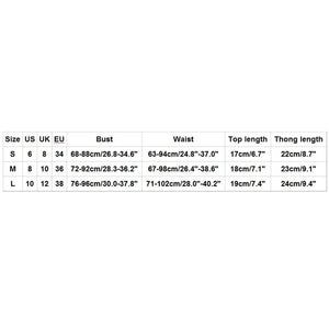 | Size:S | US:6 | UK:8 | EU:34 | Bust:68-88cm/26.8-34.6" | Waist:63-94cm/24.8"-37.0" | Top length:17cm/6.7" | Thong length:22cm/8.7" |