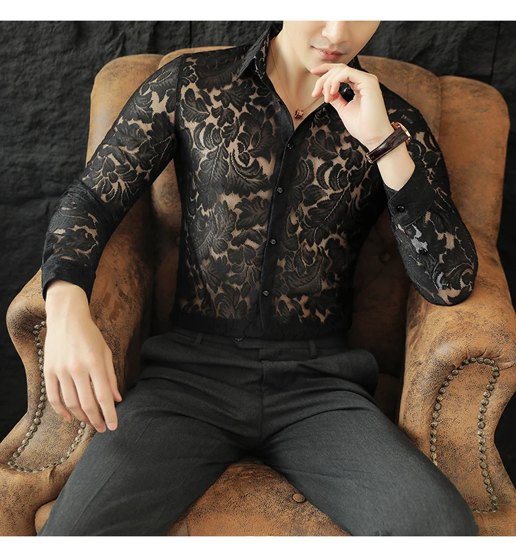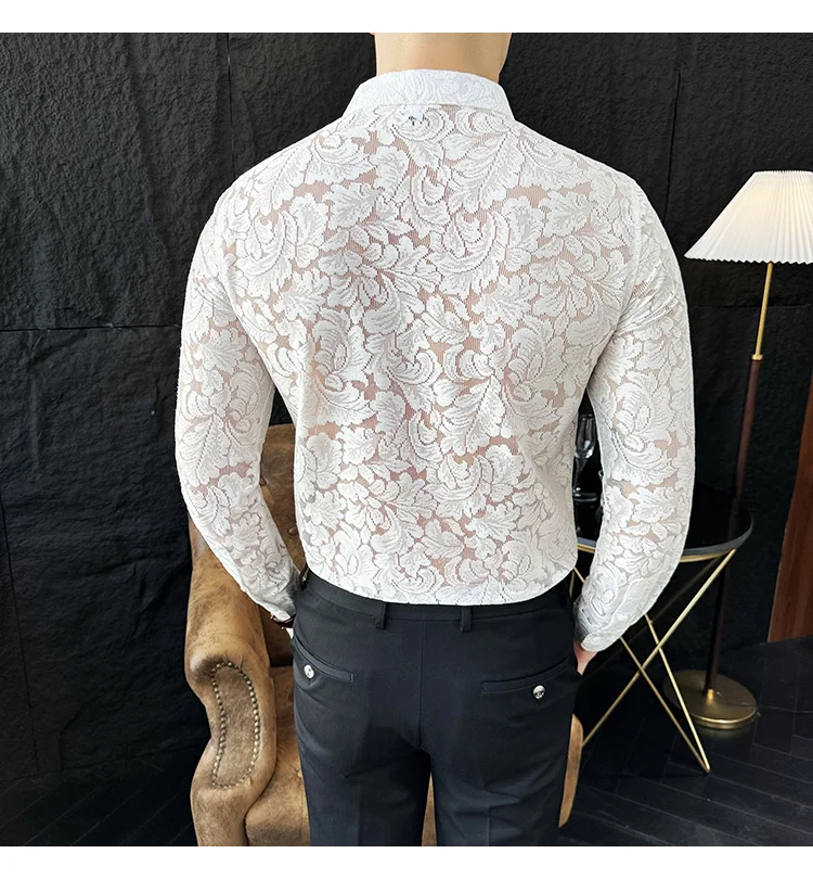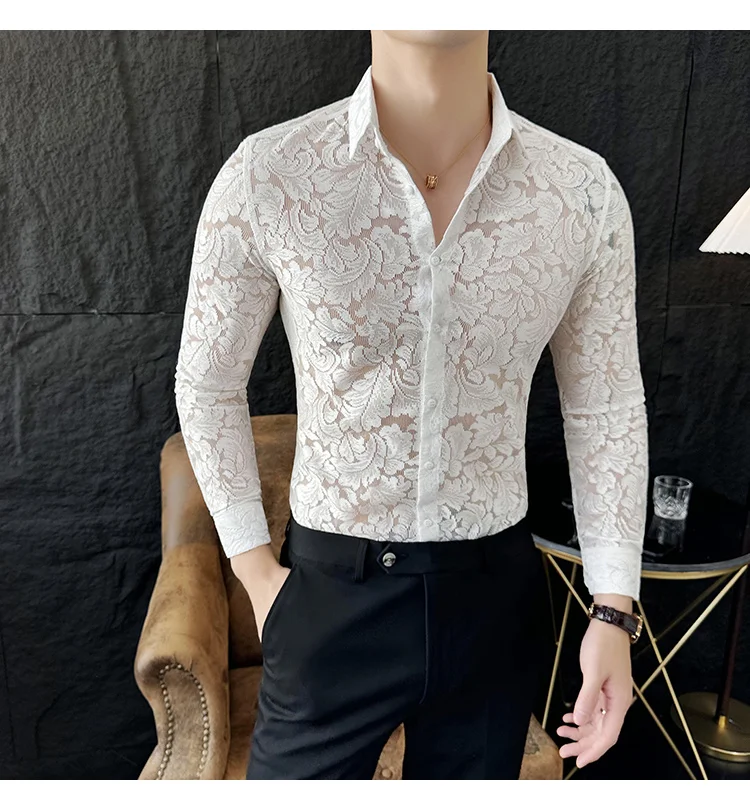 Sexy Transparent Lace Shirts For Men Korean Luxury Clothing Slim Fit Casual Long Sleeve Men's Social Shirt Dress Elegant Tuxedo