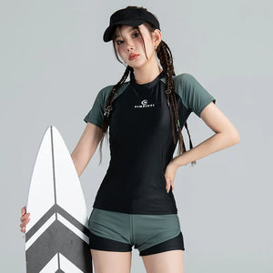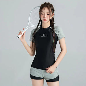 Short Sleeve Women Black Green Two Piece Swimsuit Sun Protection Sports Girls Swimwear Korea Beach Bathing Suits Shorts Trunks