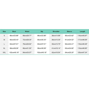 | Size:XXL | bust:102cm/40.16'' | Waist:84cm/33.07'' | Hip:102cm/40.16'' | Shoulder:42cm/16.54'' | Sleeve:64cm/25.20'' | Length:120cm/47.24'' |