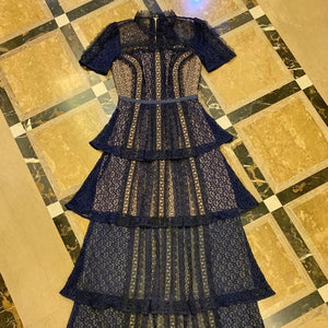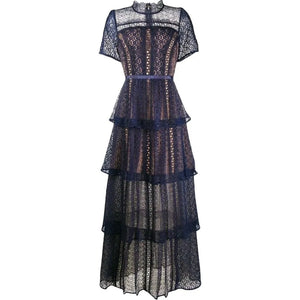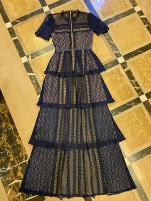 Spring/Summer New Women's Water soluble Lace Splicing Deep Blue A-line Layer Cake Slim Fit Long Dress