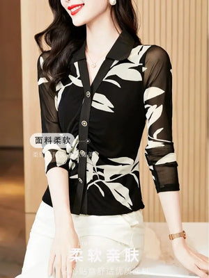 Spring Summer woman New Medal Fashion Printed Flower Soft Tops V-neck Mesh Long Sleeve Smooth Silm T-shirt Female M-3XL