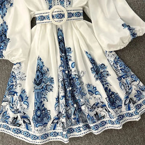 Spring Women Dresses Print Lantern Sleeve V Neck Dress Patchwork Ruffles Belt Loose Pullover Boho Vestidos Slight Strech