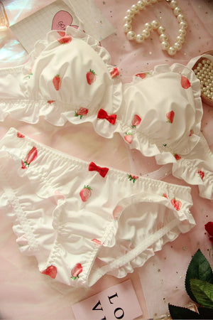Strawberry Cute Japanese Milk Silk Bra & Panties Set Wirefree Soft Underwear Set Kawaii Lolita Bra and Panty Set Pink Lingerie