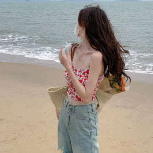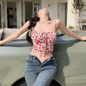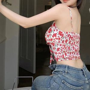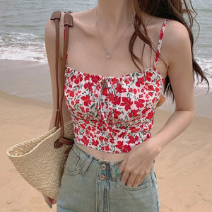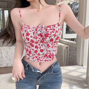 Summer Floral Print Tank Top for Women Crop Tops Flower Print Bandage Slim Short Tops