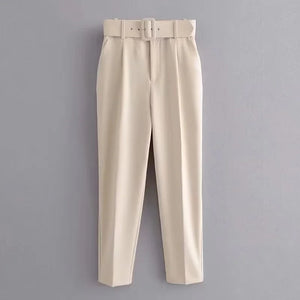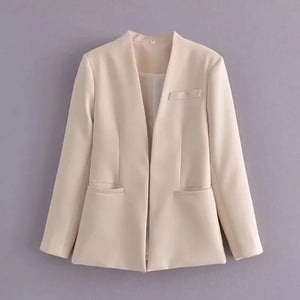 TRAFZA Office Lady Beige Women Suits Long Sleeve V Neck Oversized Blazer+High Waist Wide Leg Pants Fashion 2024 Vintage Sets