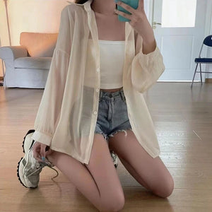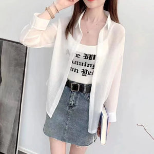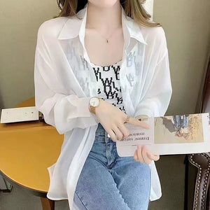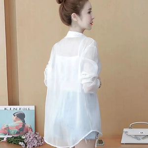White Chiffon Sun Proof Blouse Women Fashion Loose Long Sleeve Casual Thin Shirt Simple Solid Summer All Match Elegant Tops