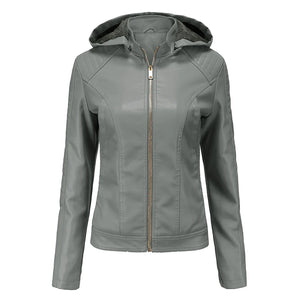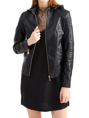 Winter Women Fleece Warmer Hooded Jacket Autumn Casual Faux Leather Zip-up Coat with Pockets Punk Hat Detachable Outwear
