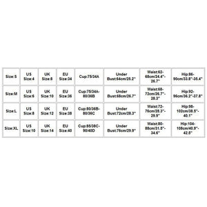 | Size:XL | US Size:10 | UK Size:14 | EU Size:40 | CUP:85/38C-90/40D | Under Bust:76cm/29.92'' | Waist:80-88cm/31.5"-34.6" | Hip:104-108cm/40.9"-42.5" |