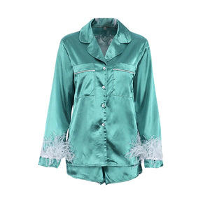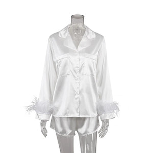 Women 2PCS Pajamas Set Plain/Patchwork Long Sleeve Feather Cuffs Shirts Tops + Short Pants Loose Sleep/Home Wear Clothes