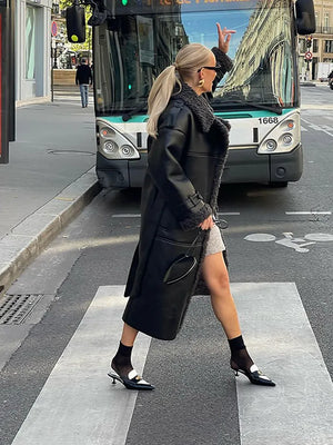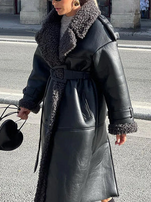 Women Black Lamb Wool Patchwork Leather Overcoat Fashion Lapel High Waist Pockets Jacket With Belt Winter Lady Street Warm Coats