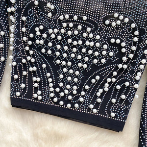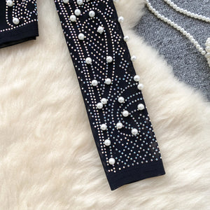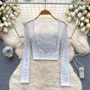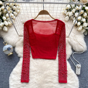 Women Chic Rhine Stone Long Sleeve Crop Top Slim Sexy Korean T-shirt Fashion Square Neck Women Shirt