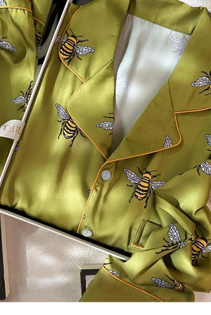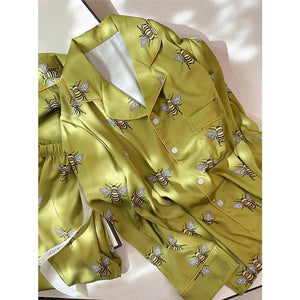 Women's Pajama Set Spring Autumn 2 Piece Pyjama Bee Print Pocket Faux Silk Satin Sleepwear Long Sleeve Pijama Mujer Pjs Homewear